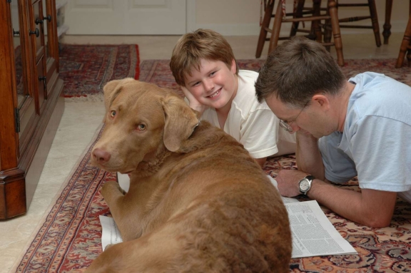We are absolutely LOVING him!!  He has been wonderful and has adapted pretty well.  Just hates being alone!!  Wants to be around people and the kids and will wake up from sleeping or just move into another room to make sure he is part of whatever is going on.  Full of kisses and I have never seen a dog whose tail wags ALL THE TIME!!  Pictures are coming soon.  It is hard to get everyone to sit down and smile at the same time (I'm sure you know how that goes!!)  I will send pics on over as soon as I get them.  He is already well over 20 lbs and is growing faster than my kids are!!  We'll keep you posted  :)   Jenn   Febuary 2007