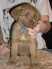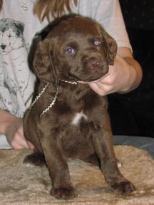 Roxy is a beautiful dog.  We began training every day as soon as we brought her home.  We live close to the Delaware River and many great gaming, farm fields and they have been perfect environment to work her natural abilities.  Roxy was very easy and eager to train.  She adapted to water immediately and picked up the concept of shooting and retrieval very early.  We don’t have little children but Roxy is extremely social with people and other animals (deer, bear, and cows).  We had Roxy on a hunt near a hedge row and heifers (cows) were in the adjoining field.  It didn’t take long for the heifers to approach us and Roxy sat calmly looking at them while one stuck its head through the fence and began licking her face.  On her first duck hunt, Roxy held her own along with a 7 year old black Labrador retriever and she had multiple retrieves.  Roxy also joins us in the boat, fishing the Delaware River and she does watch intently with every cast, but she just can’t help but jump in the river.  We had to purchase a dog ladder for the boat.  We would highly recommend your Chesapeakes because of our experiences with Roxy.  Sincerely,     Rich Daniels      11/2/2007